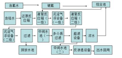 采用物理化學(xué)方法對電鍍廢水中的重金屬進(jìn)行分離處理,通過兩次調(diào)節(jié)廢 水的 pH 值,使廢水中堿性重金屬離子和中性重金屬離子分別在其最佳的沉淀 環(huán)境內(nèi)進(jìn)行沉淀分離, 達(dá)到去除重金屬的目的,使廢水達(dá)到《電鍍污染物排放 標(biāo)準(zhǔn)》(GB21900-2008)中的標(biāo)準(zhǔn),再對達(dá)標(biāo)的廢水進(jìn)行雙膜法(超濾膜+反 滲透膜)分離,進(jìn)一步去除水中的各類金屬離子,反滲透膜清水側(cè)出水達(dá)到電 鍍清洗工藝用水水質(zhì)標(biāo)準(zhǔn),回用于電鍍生產(chǎn)線,反滲透濃水側(cè)出水再經(jīng)過一次 物化沉淀,最終使?jié)馑_(dá)標(biāo)排放。